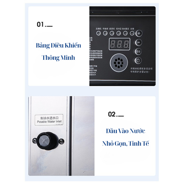 Máy có bảng điều khiển thông minh. Bạn chỉ cần cài đặt. Máy sẽ tự động bơm nước. Tự động làm đá. Tự động xả đá vào thùng chứa.