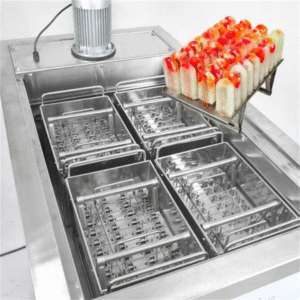 Máy làm kem que 4 khuôn là thiết bị công nghiệp chuyên dụng, sử dụng hệ thống làm lạnh sâu để cấp đông kem nhanh chóng. Máy được trang bị bốn khuôn chuẩn công nghiệp, cho phép sản xuất đồng thời hàng chục que kem trong một lần. Hỗn hợp kem được rót trực tiếp vào khuôn, sau đó được làm lạnh nhanh ở nhiệt độ thấp để tạo ra thành phẩm kem mượt, đẹp và đều.