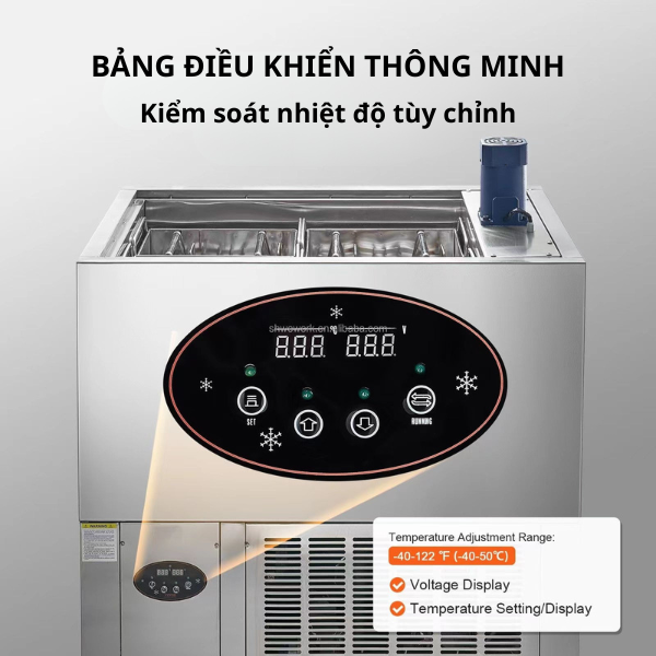 Bảng điều khiển giúp người dùng theo dõi và chỉnh nhiệt độ phù hợp. Việc điều chỉnh nhiệt chính xác giúp kem đông đúng chuẩn, không bị rỗ hay biến dạng.