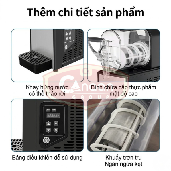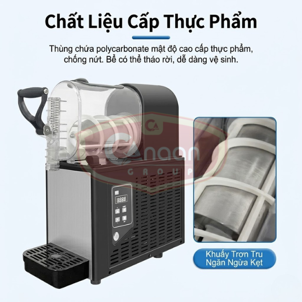 Hệ thống khuấy trộn liên tục bên trong máy giúp hỗn hợp siro. Hoặc nước trái cây không bị đông cứng hoàn toàn mà chuyển thành dạng đá tuyết mềm mịn.